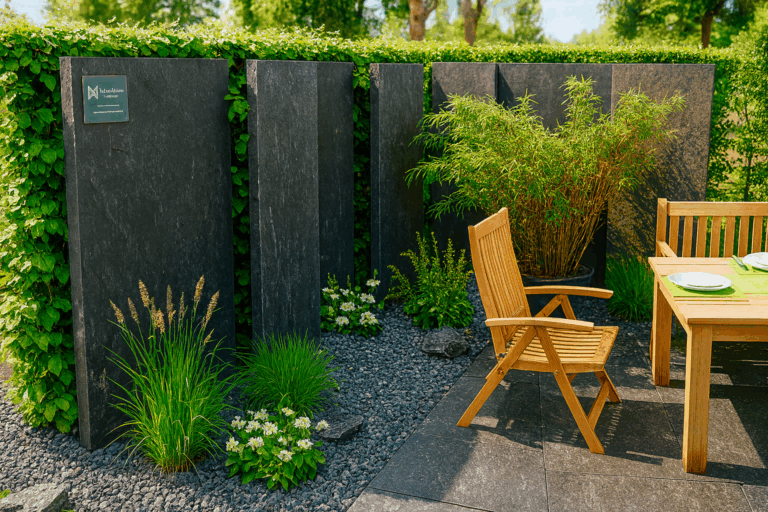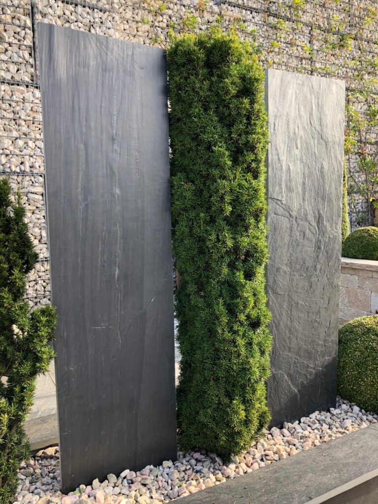 Pierre naturelle dans les tons foncés et à l’aspect naturel. Cette palissade apportera une touche de modernité et sobriété à votre espace.
